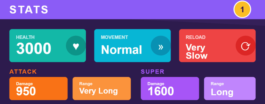 Pierce starts with around 3000 health at base level, which ain’t much compared to tankier folks in Brawl Stars. Bump him up to max, though, and he hits 6000, still fragile but enough to poke from afar without dying instantly. His movement’s normal speed, nothing flashy, but that very long range lets him harass enemies before they even spot him. Damage sits at 950 per shot, scaling higher with power levels, and his reload’s painfully slow if you miss those hits. What saves him is the variable output – land a shot, drop a shell, pick it up, and boom, extra piercing attack that ignores walls sometimes. It’s like the game rewards you for not sucking at aiming, which keeps matches feeling fresh.